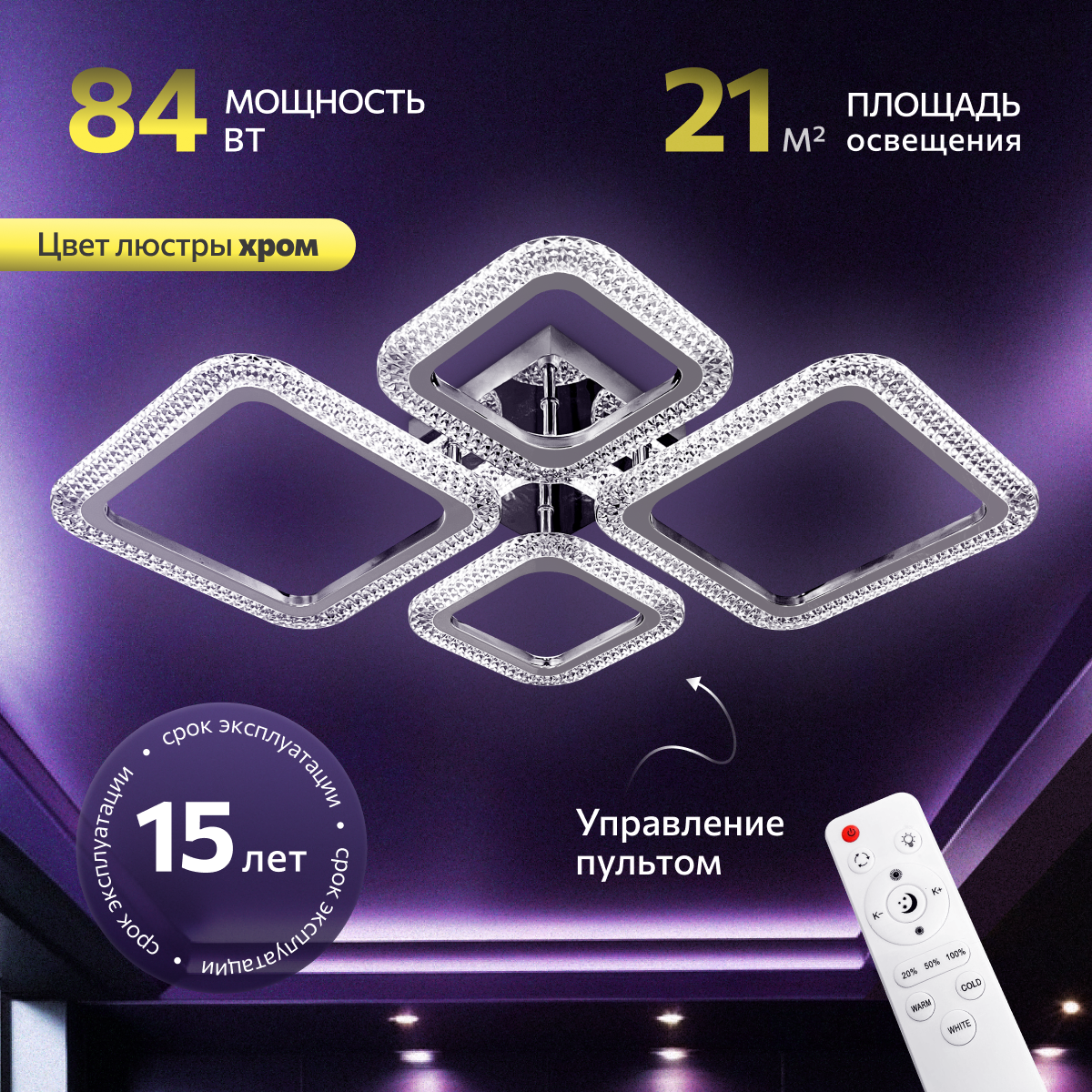 Люстра с пультом светодиодная потолочная 84W, 4 лампы, ромбы, хром, LEDCITY интересное: