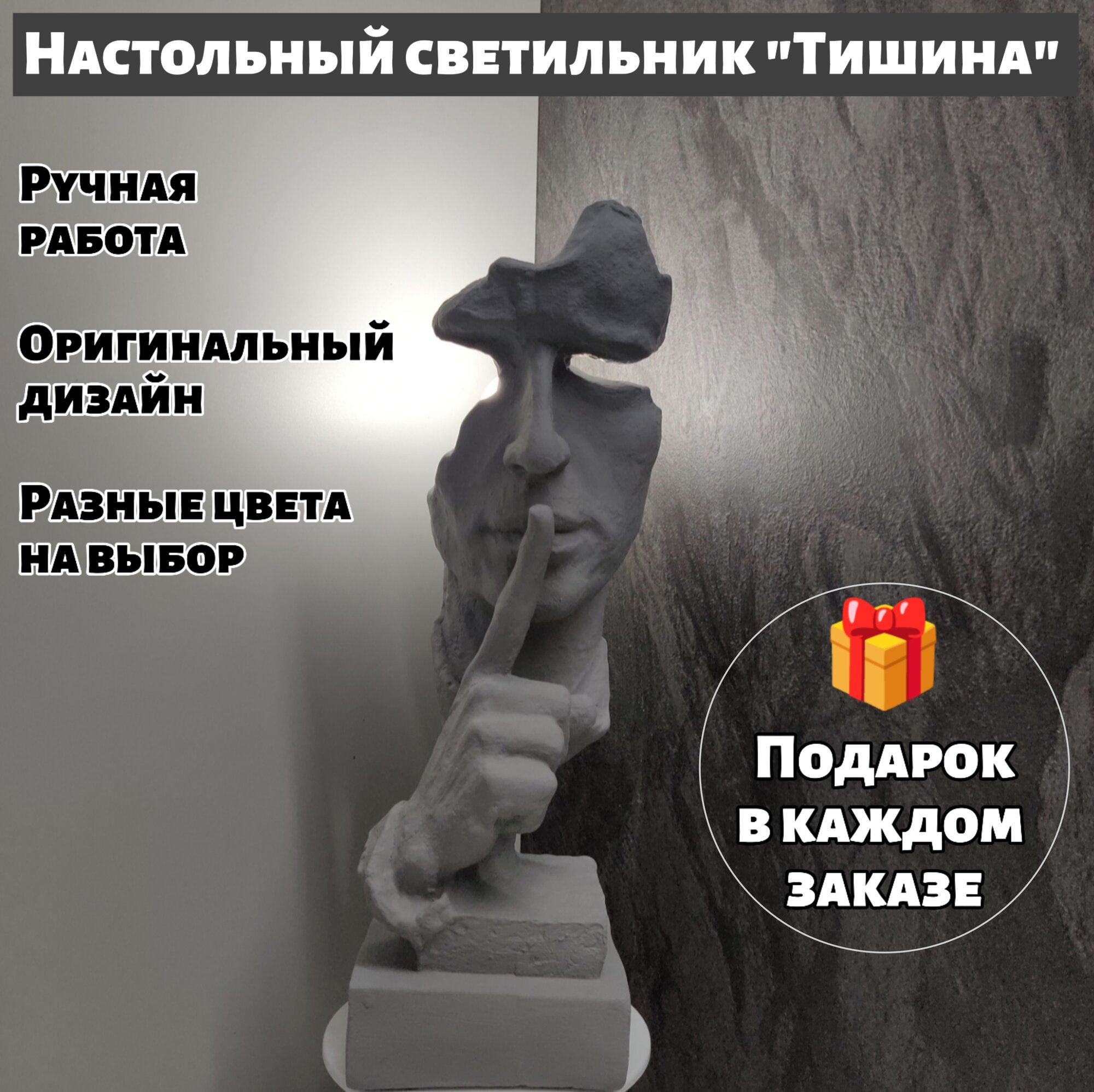 СохранитьСветильник настольный в стиле лофт "Тишина(Лицо с рукой)", цвет серый интересное: