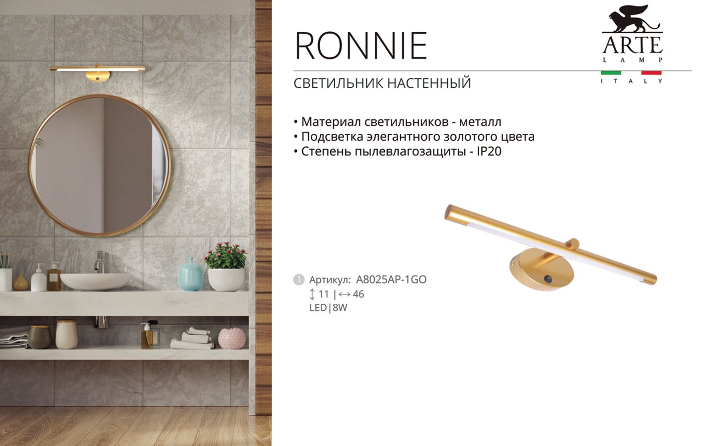 Купить Подсветка для зеркал Arte Lamp Ronnie A8025AP-1GO