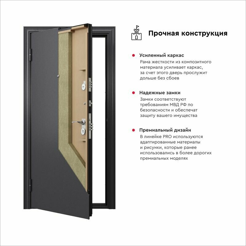 | Дополнительная информация | Замок основной цилиндрический, 4-го класса защиты. Замок дополнительный сувальдный, 2-го класса защиты. Ночная задвижка. Противосъемные ригели с петлевой стороны полотна - 2 шт. Металлический эксцентрик для регулировки притвора входной двери. Петли с опорным подшипником – 2 шт. Комплект фурнитуры. |