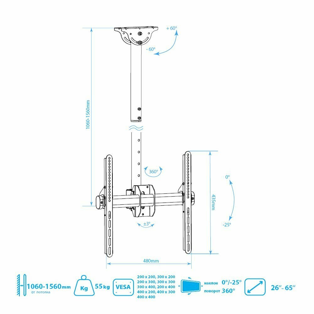 Кронштейн для телевизора потолочный Arm Media LCD-1700 / до 65 дюймов / до 55 кг / vesa 400x400 / наклонно-поворотное крепление для тв / держатель для телевизора
