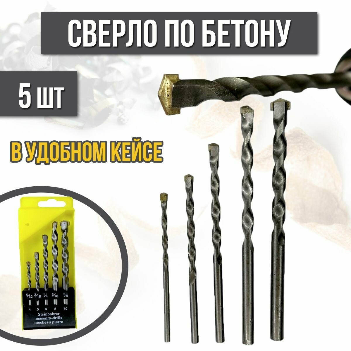 Ниже Вы можете прочитать отзывы на Набор сверл ударных по бетону и кирпичу, диаметр 4, 5, 6, 8, 10 мм, 5шт, ознакомится с подробными характеристиками, посмотреть интересные обзоры и фотографии на Набор сверл ударных по бетону и кирпичу, диаметр 4, 5, 6, 8, 10 мм, 5шт.