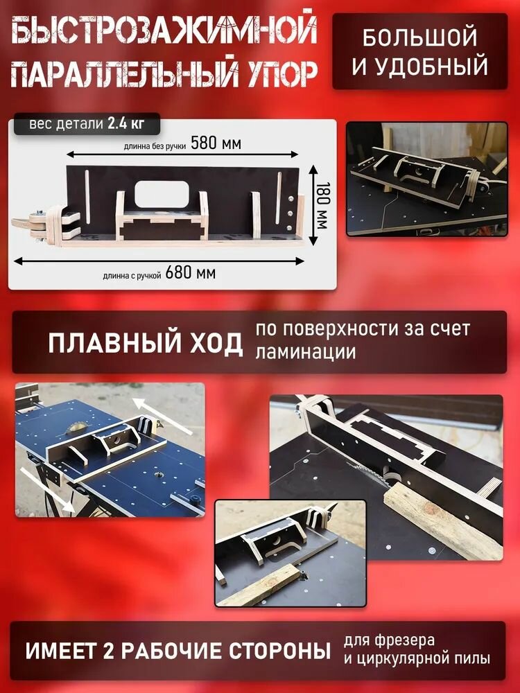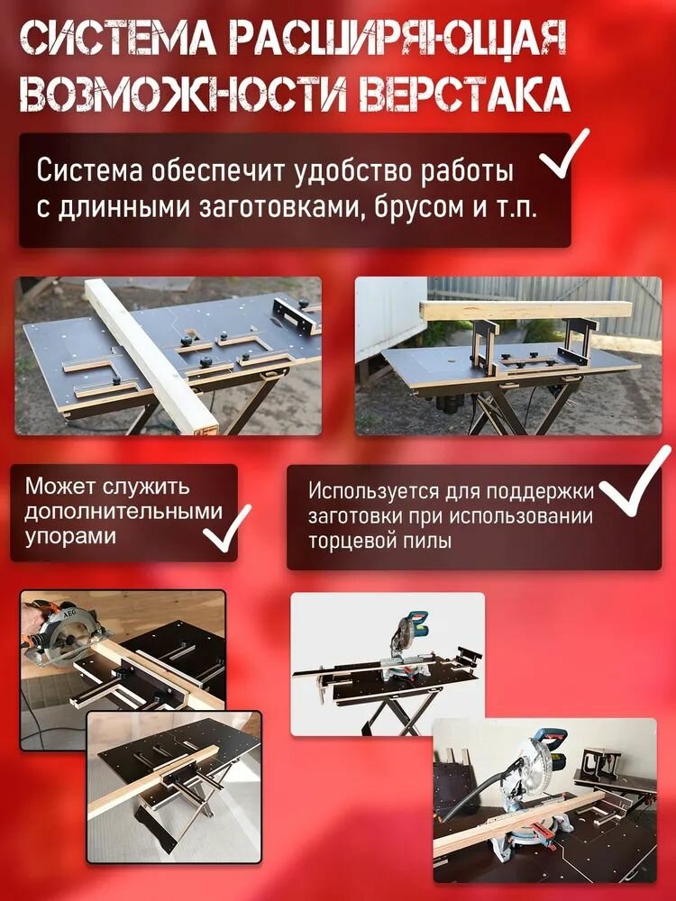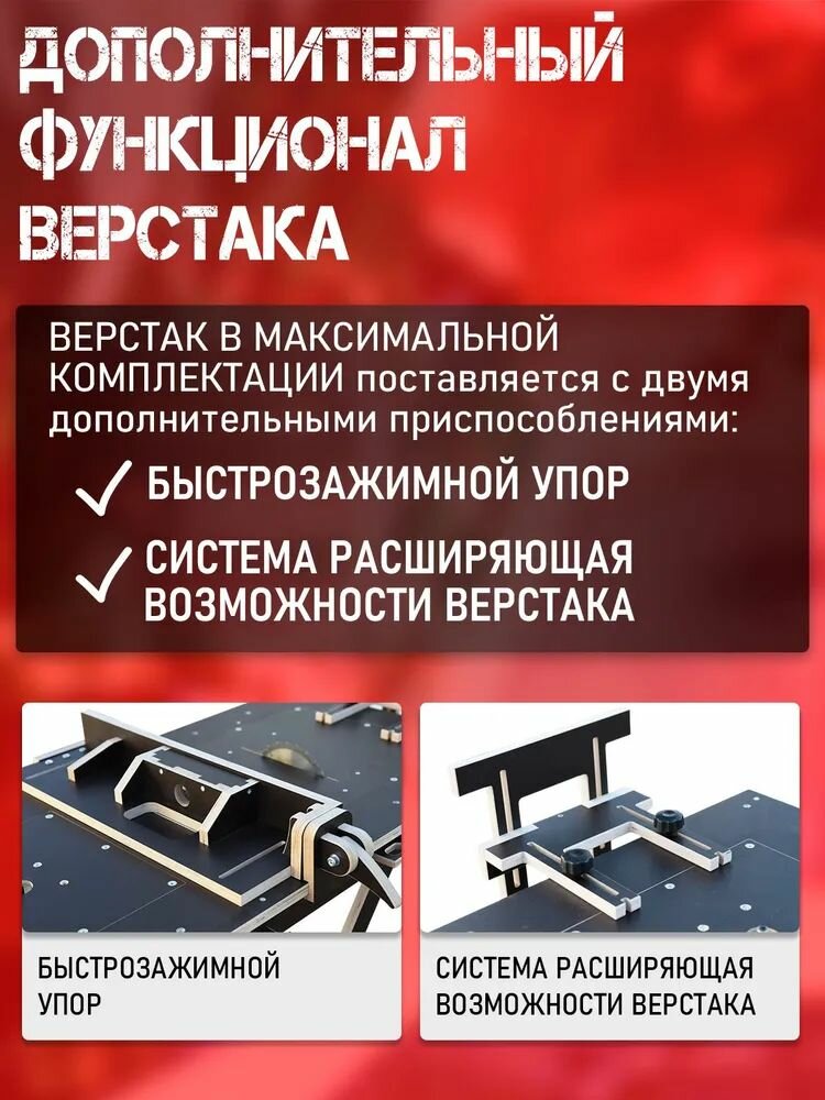 | Подробная комплектация | Верстак, вставка универсальная без пропила, вставка для фрезера, параллельный быстрозажимной упор, система расширяющая возможности верстака (состоит из 4 элементов), барашки 6 штук |