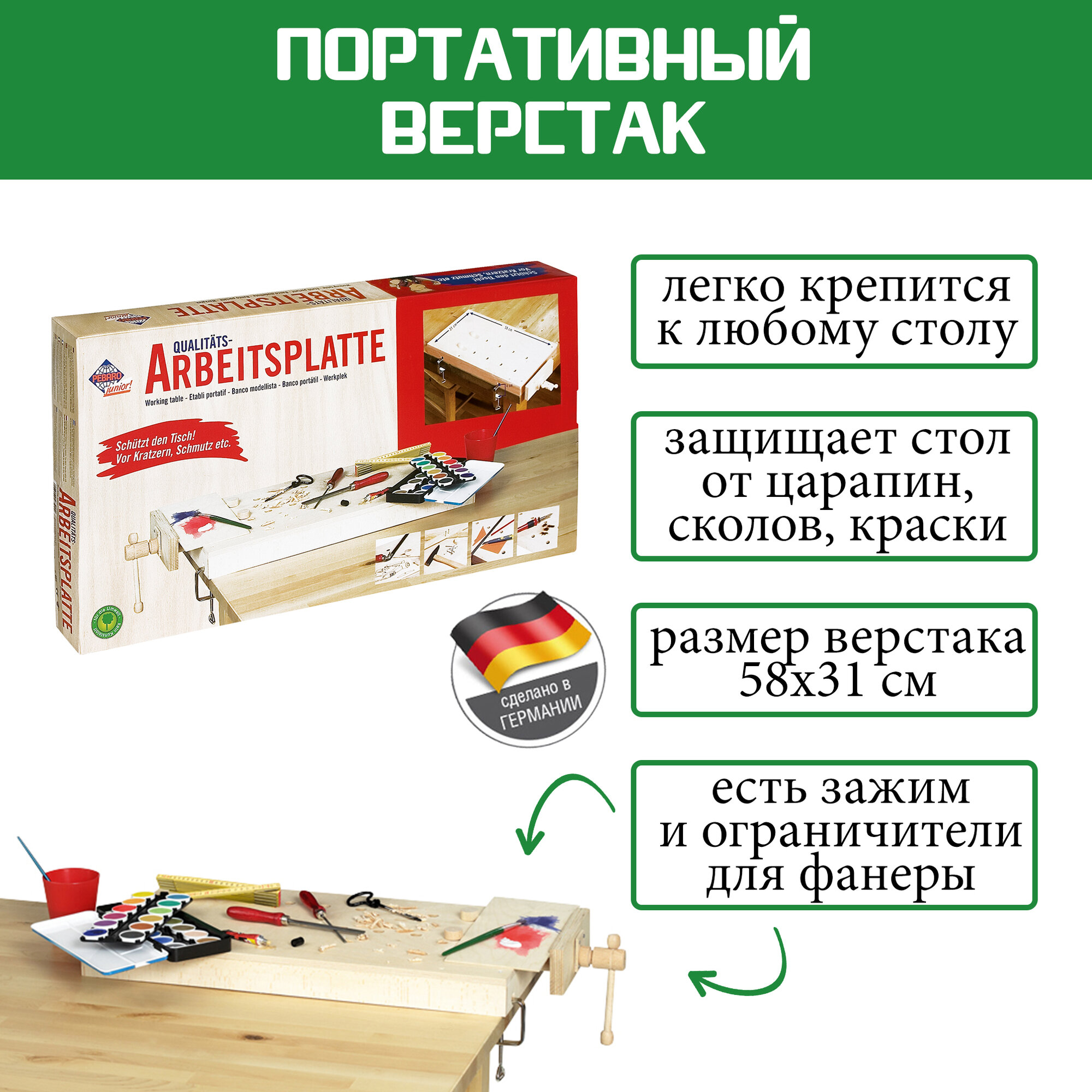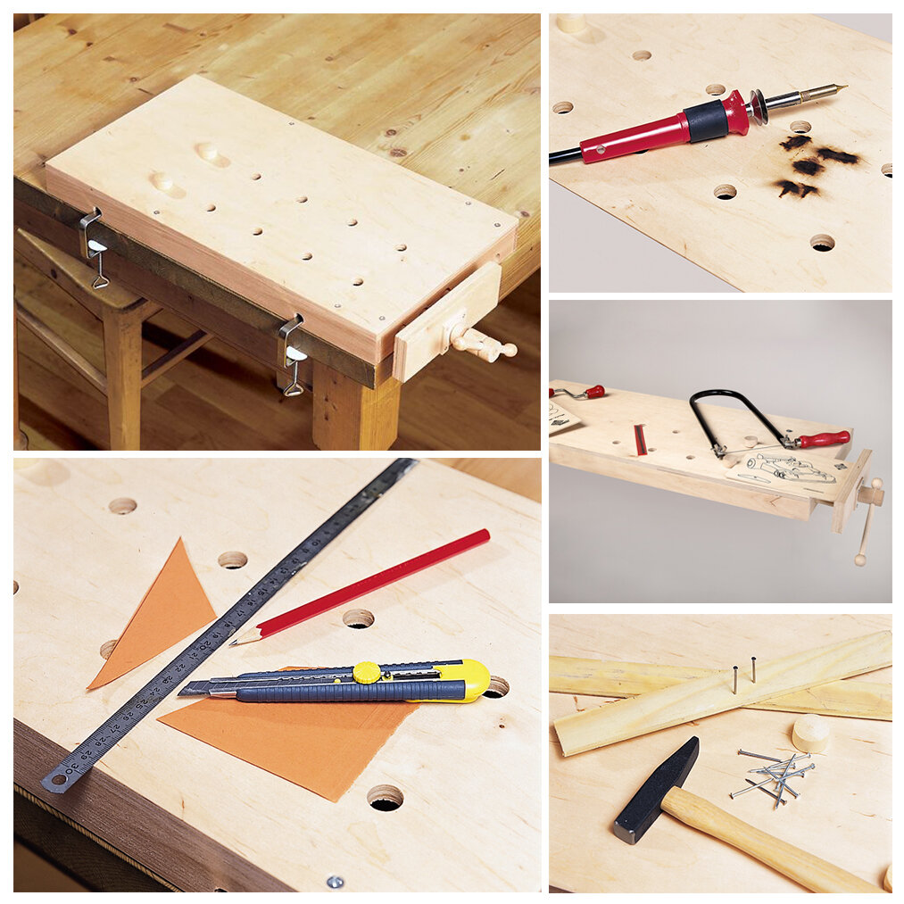 | Дополнительная информация | Верстак изготовлен из натурального дерева, есть 2 струбцины для крепления к столу |