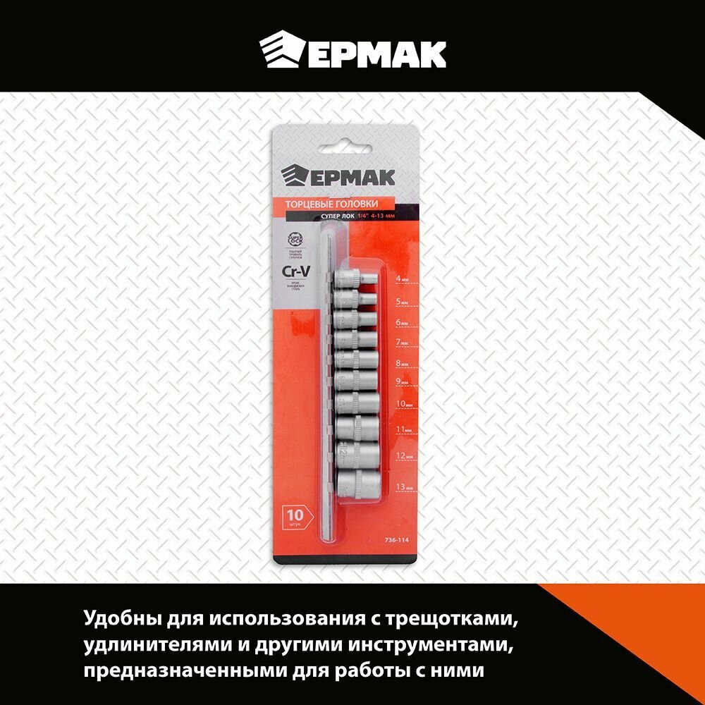 Ермак Набор торцевых головок SuperLock ермак 736-114, CrV, 1/4", 4 - 13 мм, 10 предметов