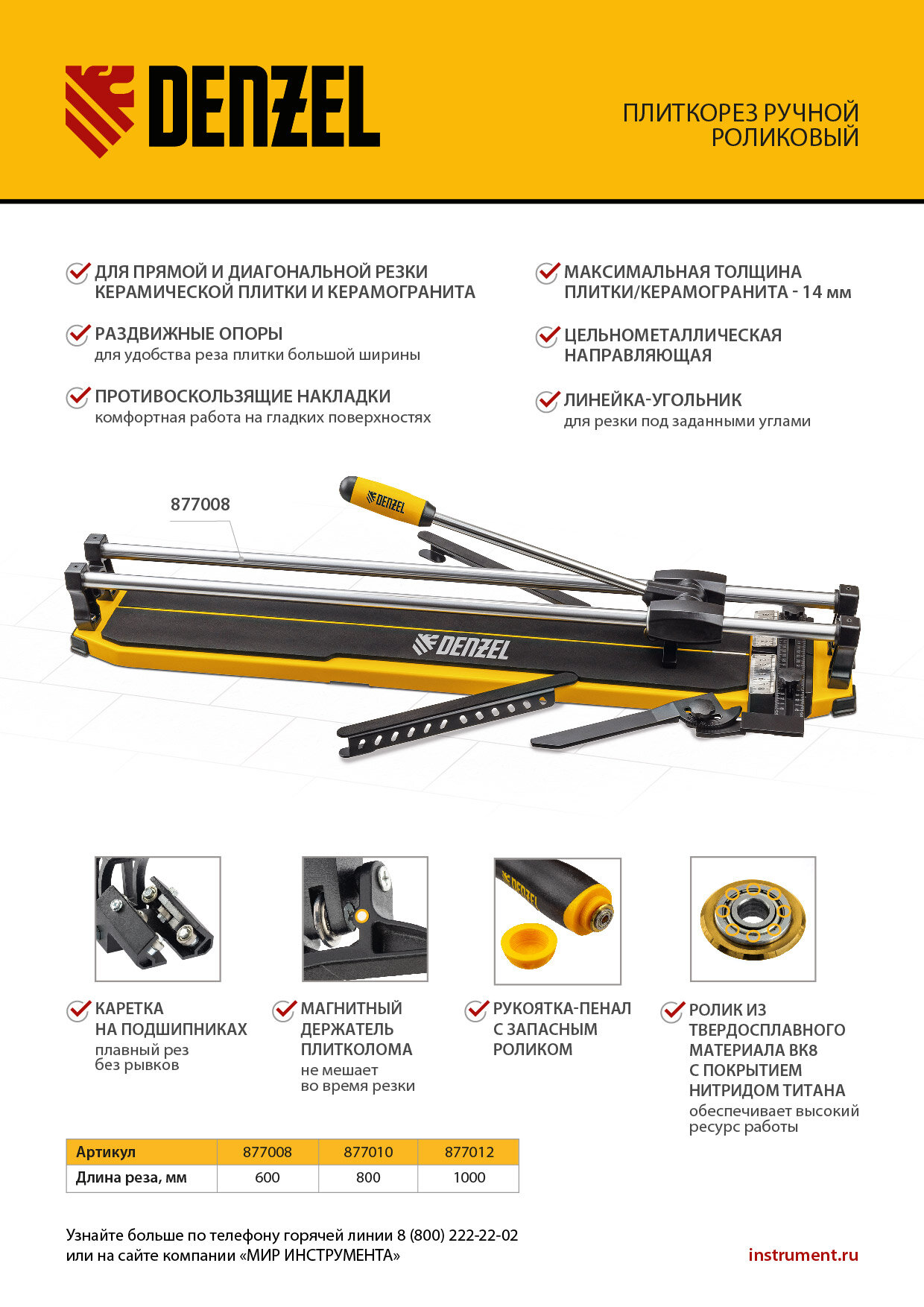 Плиткорез 600х14мм, цельнометал. напр., каретка на подш., стальная станина, рукоятка-пенал Denzel, 877008 интересное: