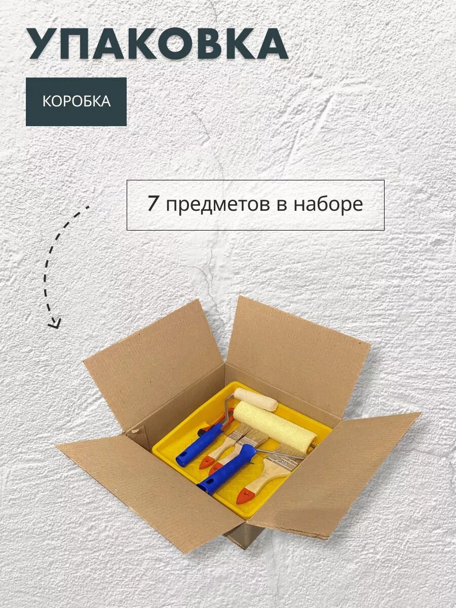 | Подробная комплектация | В наборе: ванночка малярная 280х230 мм - 1 шт., валик велюровый 180 мм - 1 шт., мини-валик 100 мм - 1 шт., кисть 63 мм - 1 шт., кисть 38 мм - 1 шт., кисть 25 мм - 1 шт., нож канцелярский 18 мм - 1 шт. |