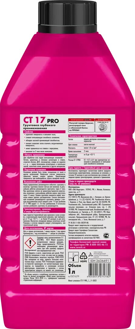 | Дополнительная информация | Грунтовка глубокого проникновения Церезит CT17 1 л |