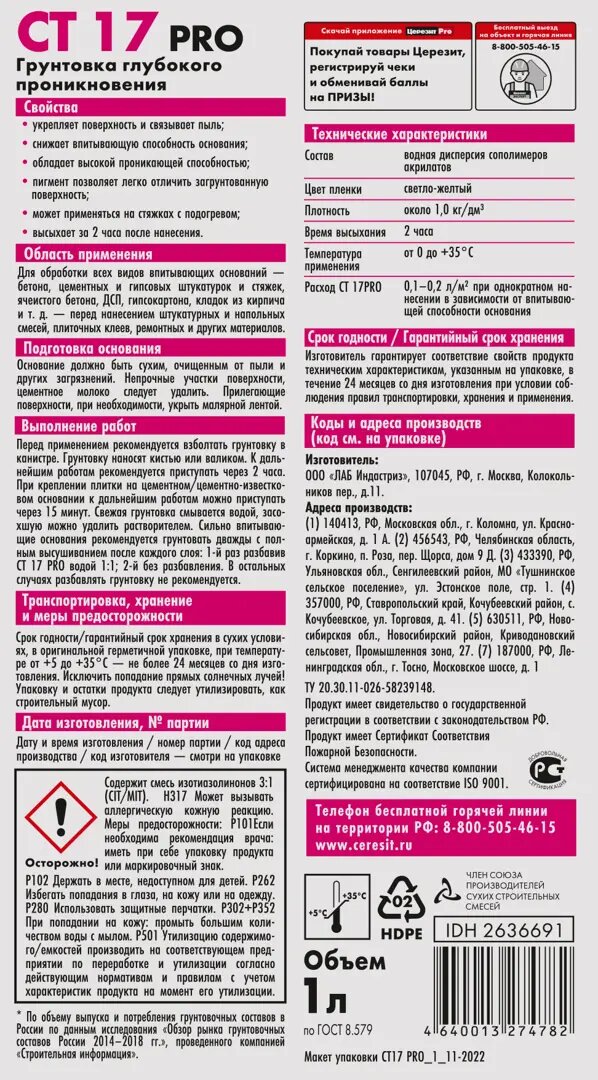 Грунтовка глубокого проникновения Церезит CT17 1 л интересное: