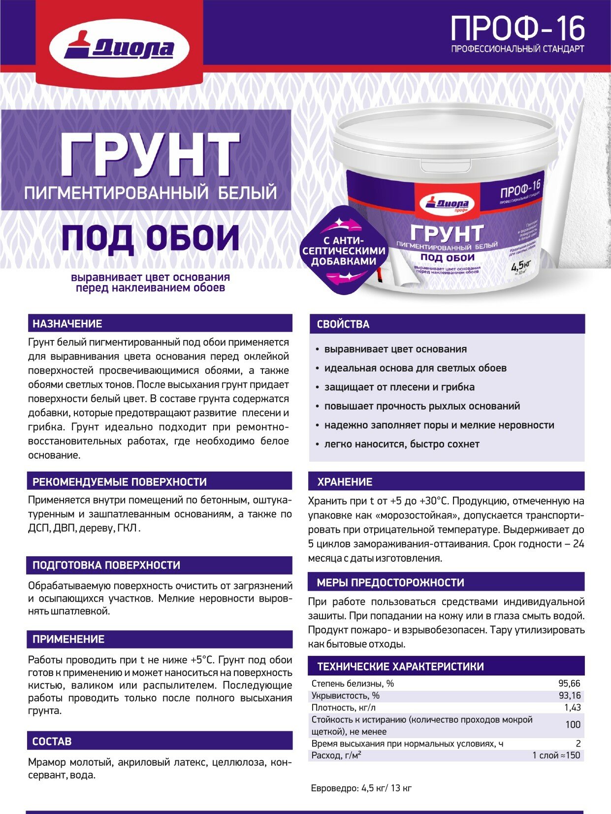 Грунт пигментированный под обои ПРОФ-16 Диола 1,5 кг белый интересное: