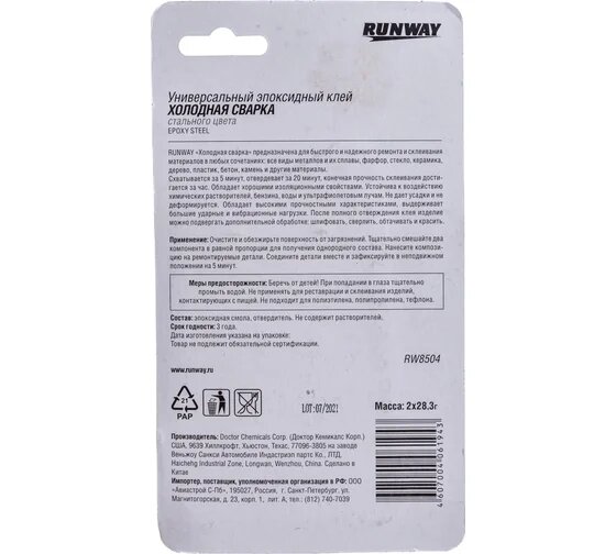 Универсальный эпоксидный клей «холодная сварка» стального цвета / двухкомпонентный клей для стекла, пластика, дерева / RUNWAY / RW8504 интересное: