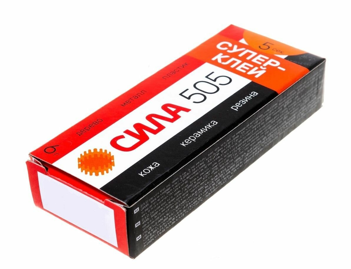 | Дополнительная информация | Супер-клей СИЛА 505 – проверенный клей с отличными свойствами. Обладая высокой концентрацией цианакрилата и хорошей текучестью, он особенно эффективен для склеивания металлических деталей. Успешно применяется для пластика, дерева, кожи, резины, керамики, фарфора. Экономично расходуется и застывает за 5 секунд. |