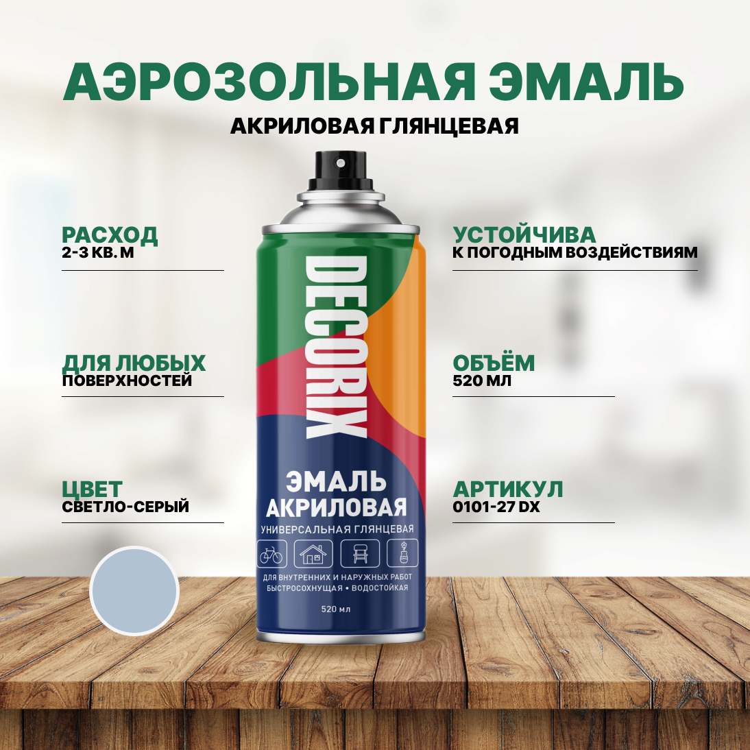 Ниже Вы можете прочитать отзывы на Decorix Аэрозольная эмаль универсальная (светло-серый, глянцевый, 520 мл), ознакомится с подробными характеристиками, посмотреть интересные обзоры и фотографии на Decorix Аэрозольная эмаль универсальная (светло-серый, глянцевый, 520 мл).