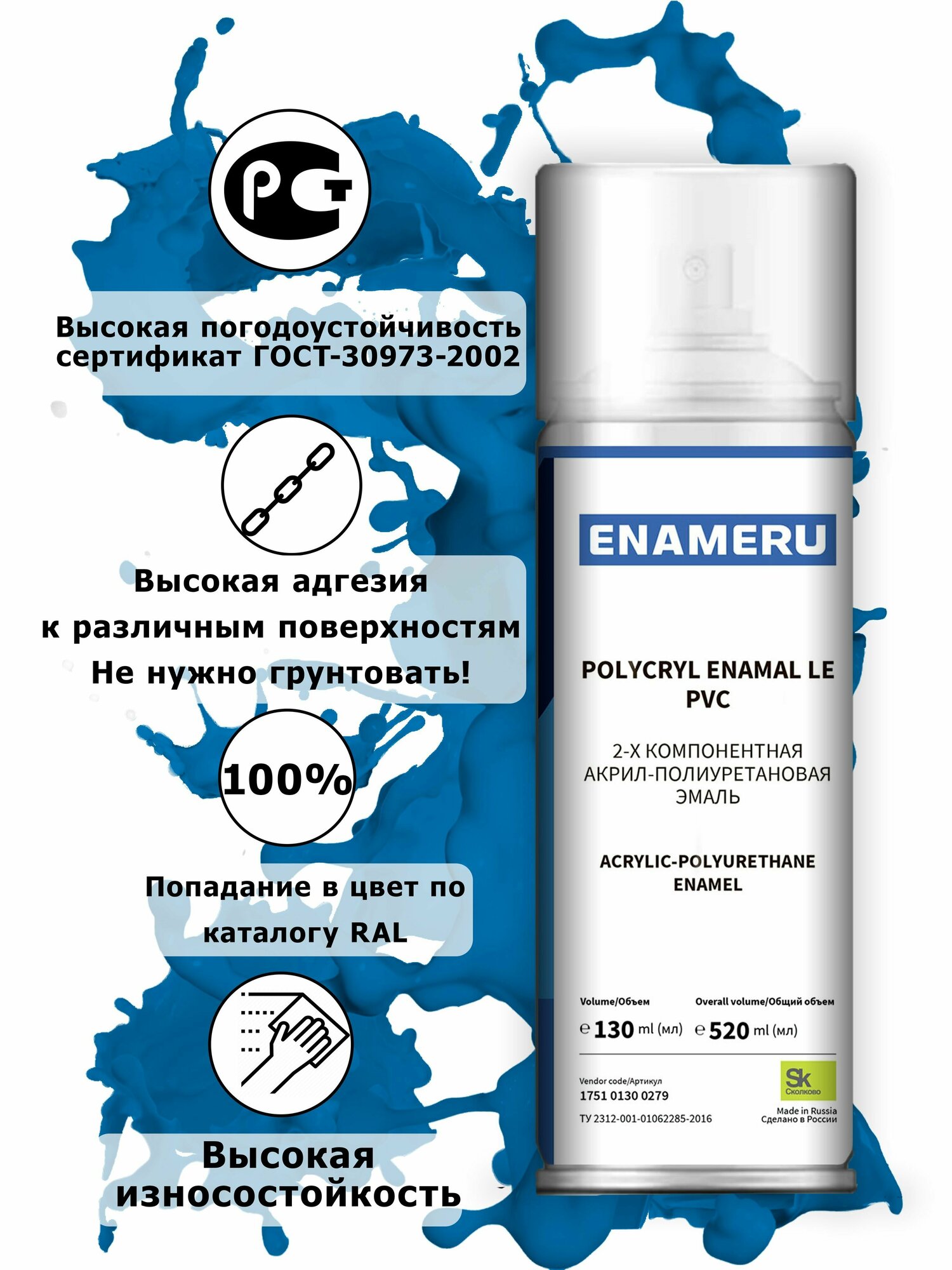 Структурная краска для ПВХ, пластика, окон Энамеру, Быстросохнущая, Акрил-полиуретановая, Полуматовая, 0.52 л, Бриллиантово-синий RAL 5007