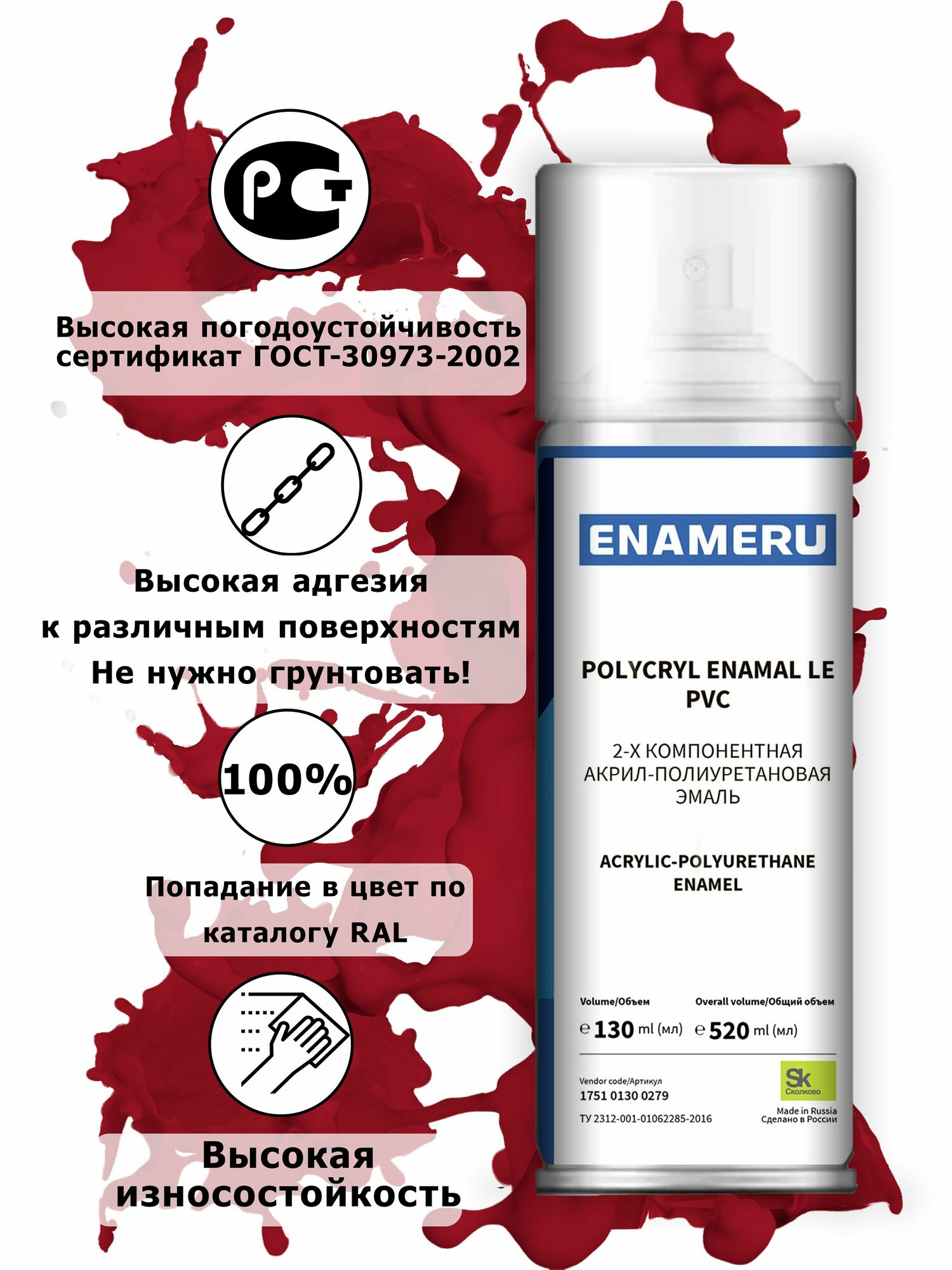 Структурная краска для ПВХ, Пластика Энамеру, Акрил-полиуретановая, Полуматовая, Рубиново-красный RAL 3003, 0.52л