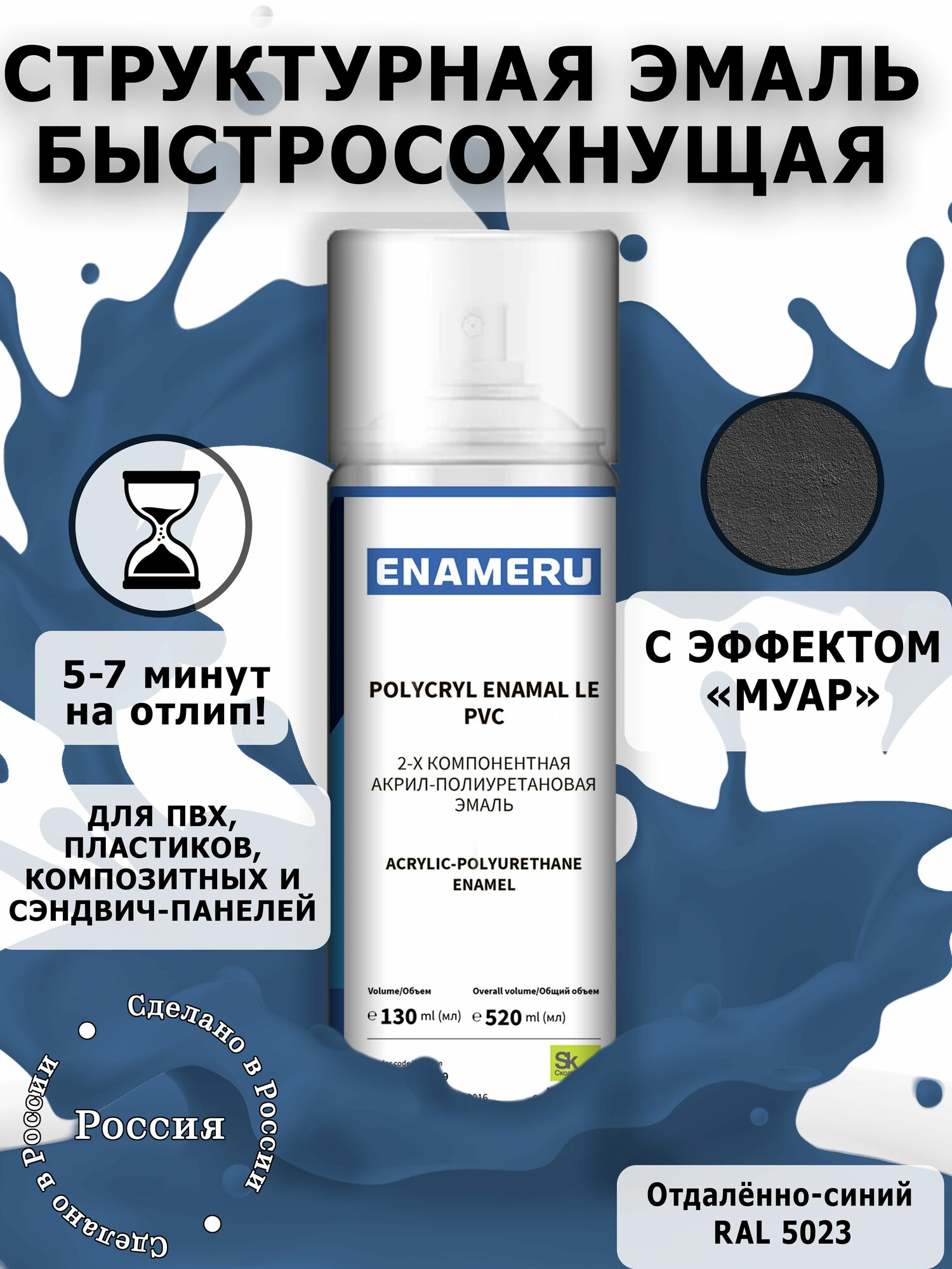 Структурная краска для ПВХ, пластика, окон Энамеру, Быстросохнущая, Акрил-полиуретановая, Полуматовая, 0.52 л, Бриллиантово-синий RAL 5007