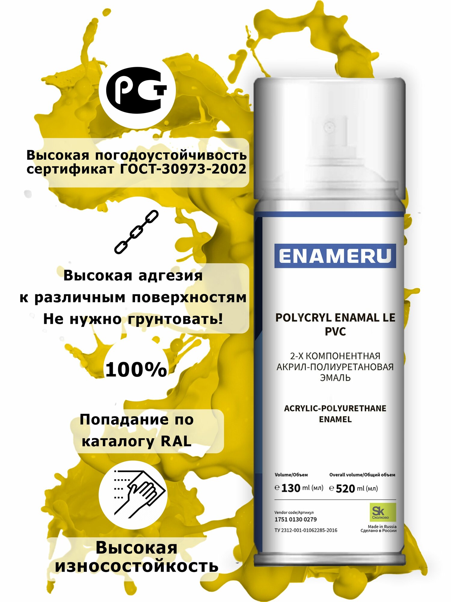 Структурная краска для ПВХ, Пластика Энамеру, Акрил-полиуретановая, Полуматовая, Сигнальный желтый RAL 1003, 0.52л
