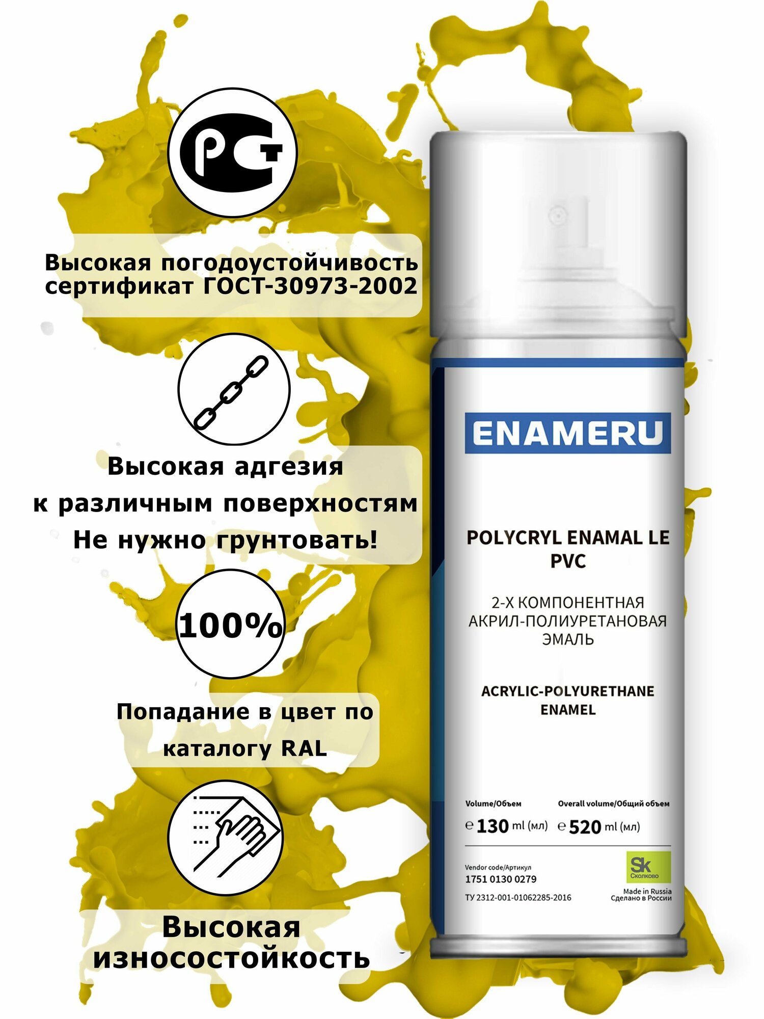 Структурная краска для ПВХ, Пластика Энамеру, Акрил-полиуретановая, Полуматовая, Цинково-желтый RAL 1018, 0.52л