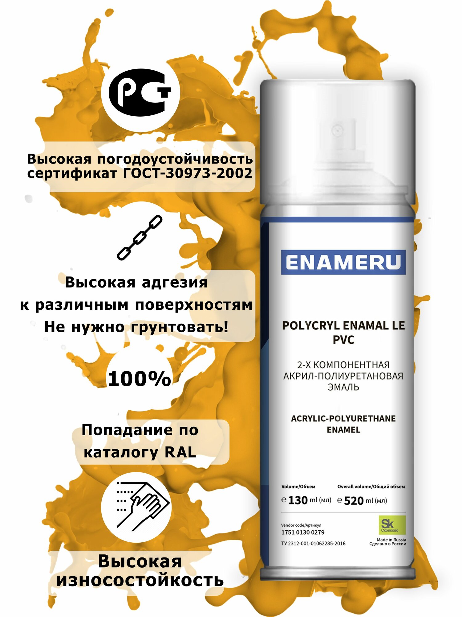 Структурная краска для ПВХ, пластика, окон Энамеру, Быстросохнущая, Акрил-полиуретановая, Полуматовая, 0.52 л, Охра желтая RAL 1024