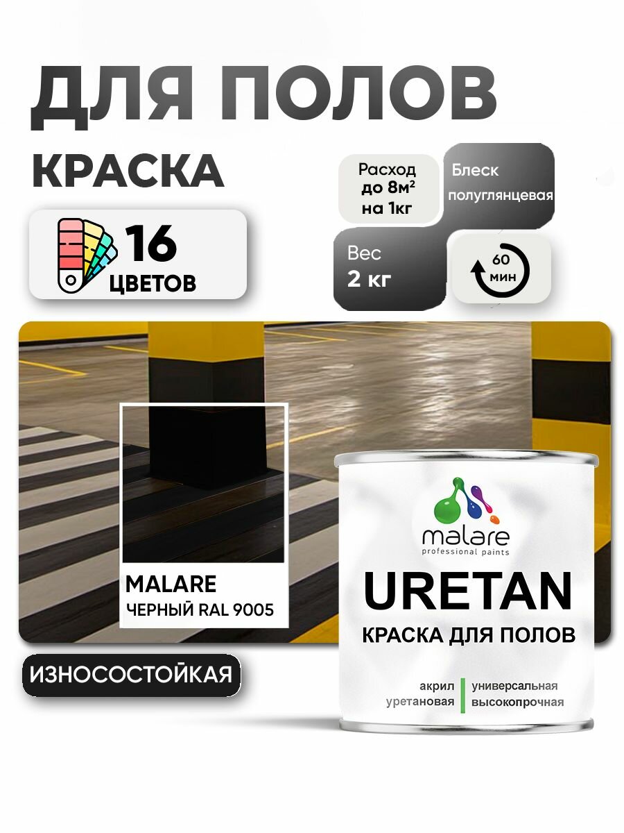 Купить Краска Malare URETAN для бетонного пола, для деревянного пола, краска по металлу, износостойкая, полуглянцевая, черная, 2 кг