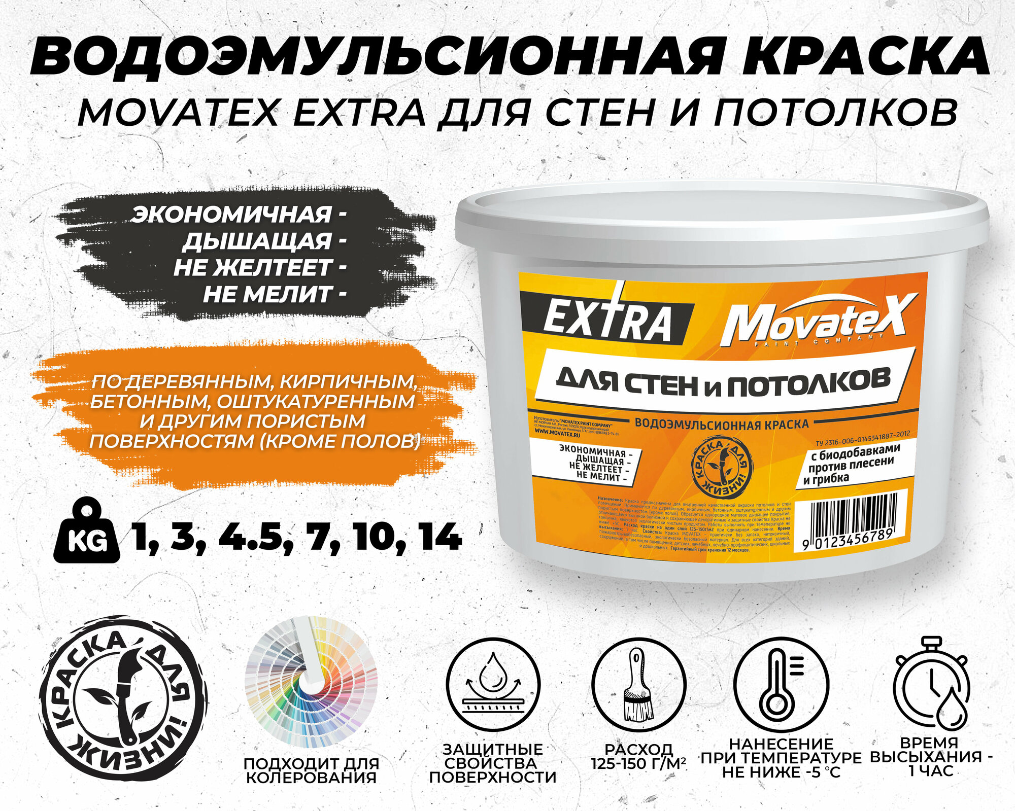 Movatex Краска водоэмульсионная EXTRA для стен и потолков 1 кг Т11869