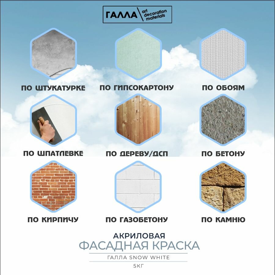 СохранитьКраска фасадная галла SNOW WHITE влагостойкая, атмосферостойкая для наружных фасадов, по бетону, камню, гипсу, дереву, ведро 5,0 кг, белоснежная интересное: