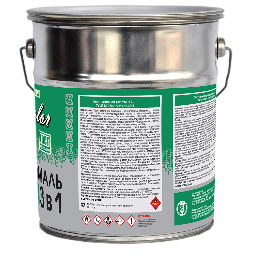 | Дополнительная информация | Грунт-эмаль премиум по ржавчине 3 в 1 "ВИТcolor" 5 кг.НАЗНАЧЕНИЕ: для окраски решеток, оград, гаражей, оборудования и других металлических изделий, как чистых, так и ржавых поверхностей.СПОСОБ ПРИМЕНЕНИЯ: перед применением грунт-эмаль тщательно перемешать. Окрашиваемые поверхности очистить от неплотно держащейся ржавчины. При необходимости разбавить сольвентом, уайт-спиритом или их смесью 1:1. При окрашивании больших площадей рекомендуется использовать грунт-эмаль одной партии.СПОСОБ НАНЕСЕНИЯ: наносить кистью, валиком, краскораспылителем в один или два слоя.ВРЕМЯ ВЫСЫХАНИЯ каждого слоя при температуре (20±2)°С не более 24 часов.РАСХОД грунт-эмали на однослойное покрытие 80-170 г/м2, в зависимости от цвета.При окрашивании больших площадей рекомендуется использовать грунт-эмаль одной партии.СОСТАВ: алкидный лак, пигменты, антикоррозионные добавки, наполнители, растворители, стабилизирующие добавки. |