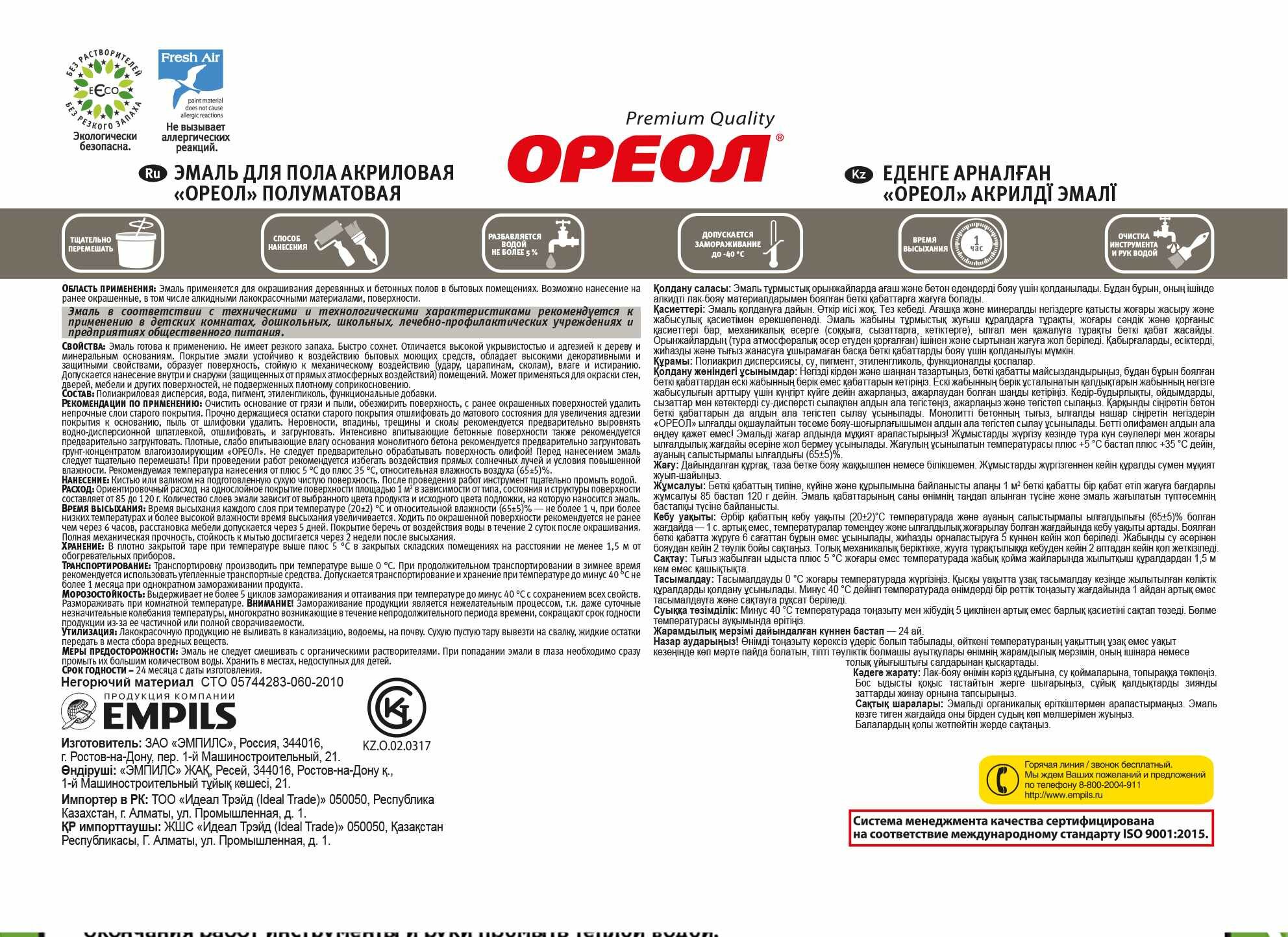 | Дополнительная информация | Эмаль акриловая Ореол подходит для деревянных и бетонных поверхностей. Может использоваться для окрашивания дверей. Быстро сохнет и не имеет резкого запаха. Пригодна для применения в детских и лечебных учреждениях. Возможно нанесение на ранее окрашенные покрытия. Состоит из полиакриловой дисперсии, воды, пигмента, этиленгликоля и функциональных добавок. Продукт полностью готов к применению. Он образует прочное полуматовое покрытие, устойчивое к воздействию бытовых моющих средств и появлению сколов, царапин. Перед использованием необходимо очистить основание от грязи и пыли, а также обезжирить и удалить непрочные слои старого покрытия. Неровности следует выровнять и отшлифовать. Рекомендуется наносить при температуре от +5°C до +35°C. |