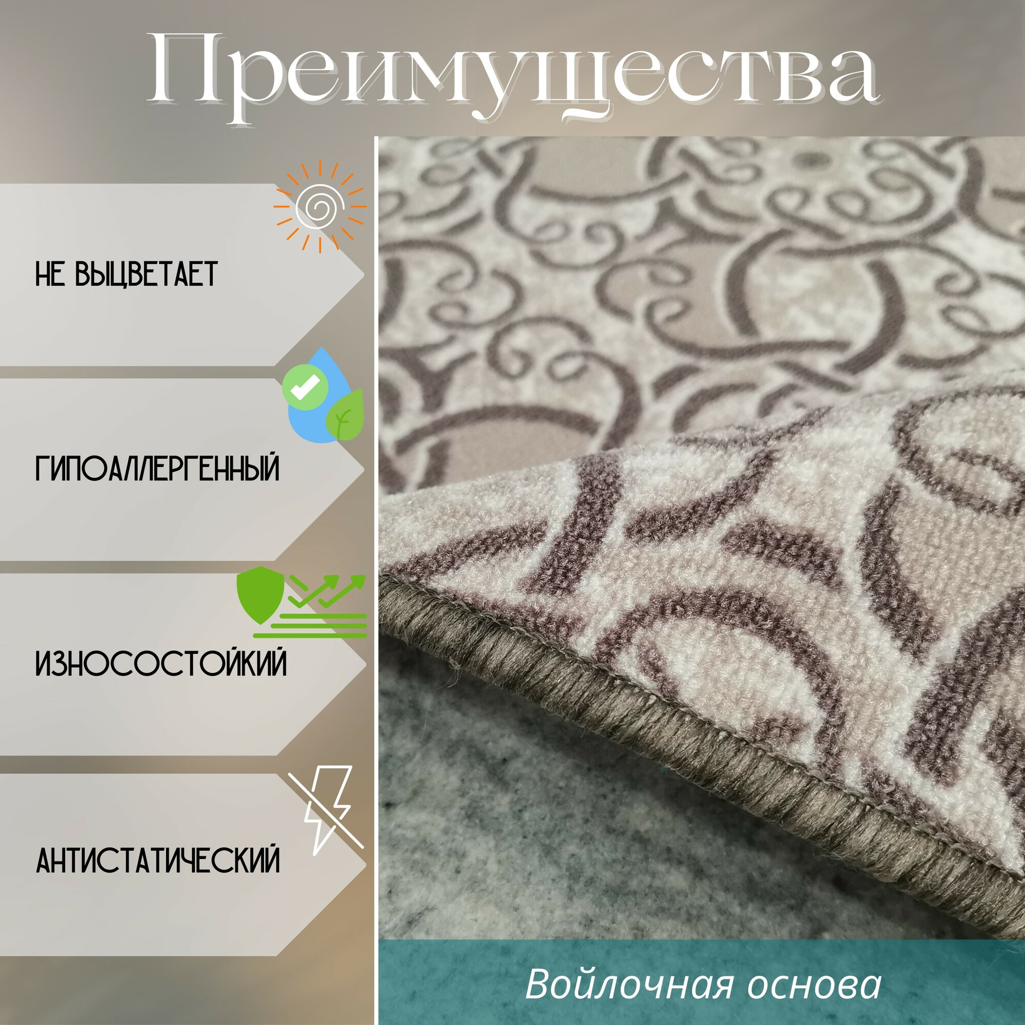 Ковролин метражом 2х2,5 м, без ворса "Графит цветком", бежевый с оверлоком
