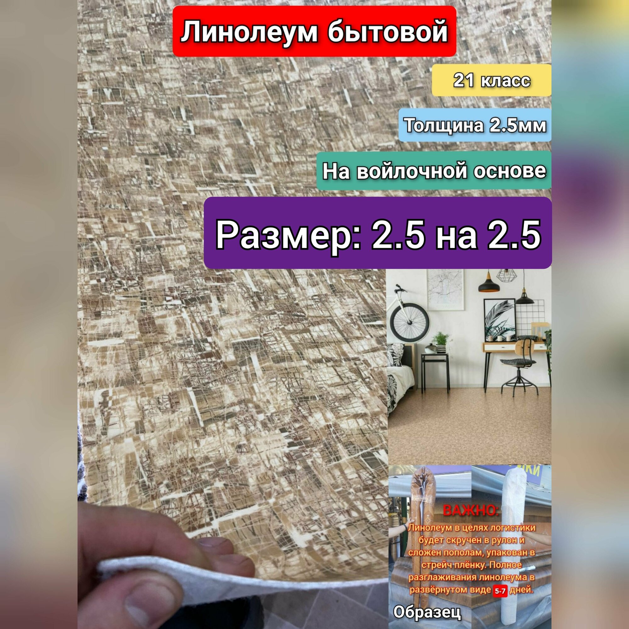 Линолеум бытовой 2.5 на 2 ФРЕСКО-5 (21 класс)Толщина 2.5 мм. На войлочной основе.