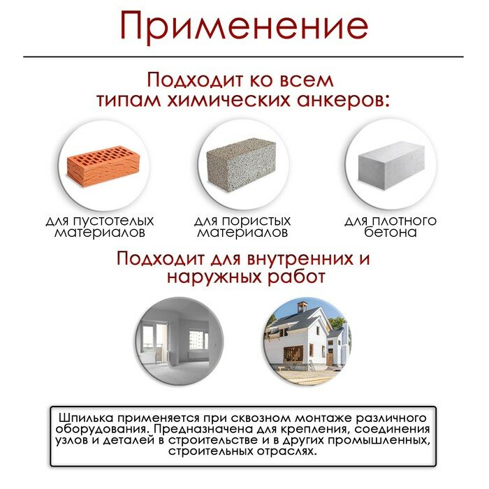 | Комплектация | • Шпилька для химического анкера с гайками шайбами - 1 набор |