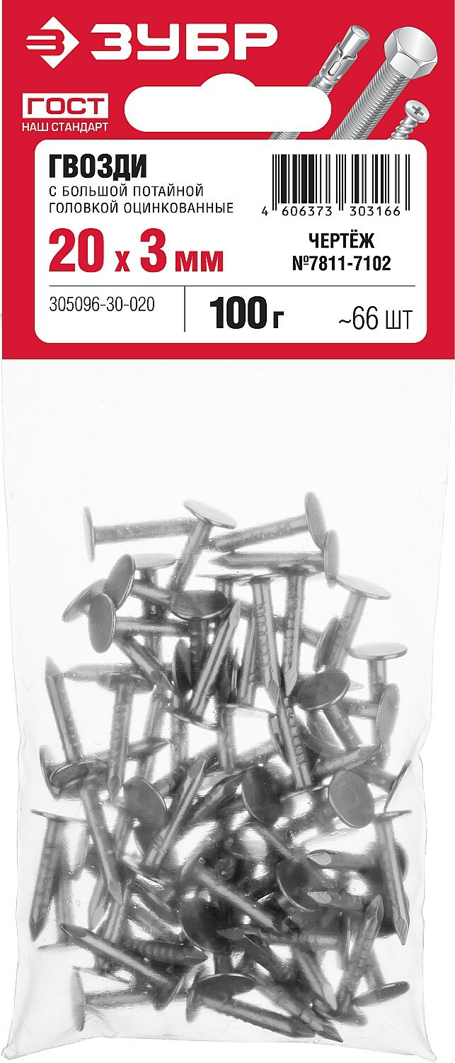 Гвозди с большой потайной головкой ЗУБР цинк 20 х 3.0 мм 100 гр. ( 66 шт.) (305096-30-020)
