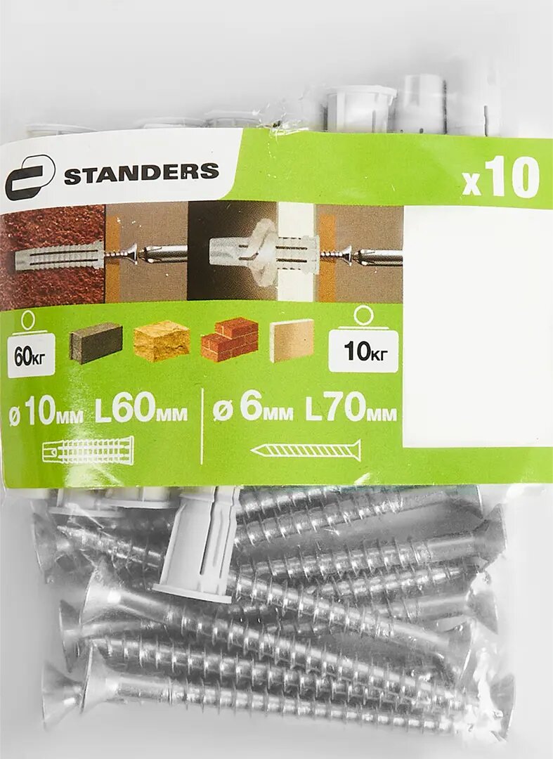 | Дополнительная информация | Дюбель потайной Standers PDU N 10х60 мм, с шурупом 6х70 мм, нейлон, 10 шт. |