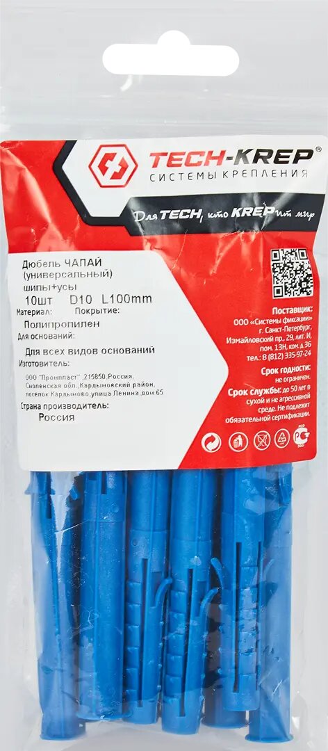 | Дополнительная информация | Дюбель распорный для полнотелых материалов Tech-Krep, 10x100 мм, полипропилен, 10 шт. |