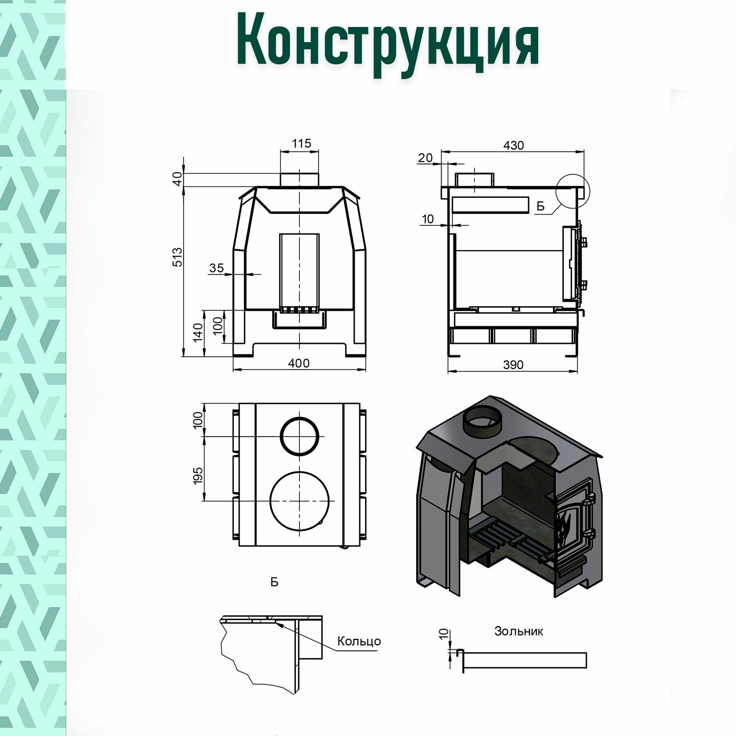 | Дополнительная информация | материал: особо прочная котловая сталь 09Г2С; материал дверки: жаростойкий чугун (ГОСТ 1412-85); толщина топки: 3 мм; размер топочной дверки наружный: 290 х 250 мм |