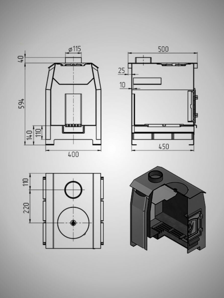 | Дополнительная информация | материал: особо прочная котловая сталь 09Г2С; материал дверки: жаростойкий чугун (ГОСТ 1412-85); толщина топки: 3 мм; размер топочной дверки наружный: 290 х 250 мм |