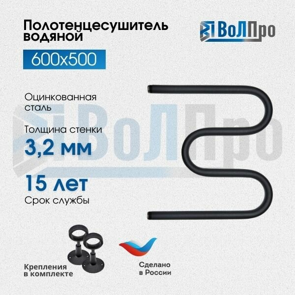 Полотенцесушитель водяной "ВоЛПро" М-образный, черный, 60x50, 1", с креплениями