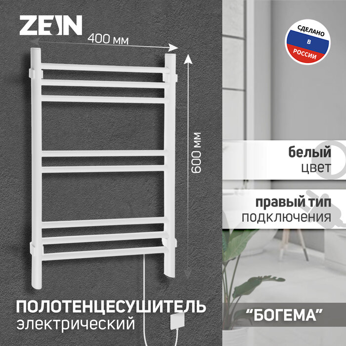 Полотенцесушитель электрический Zein PE-08 "Богема", 400х600 мм, 8 перекладин, белый Zein 10363929 .
