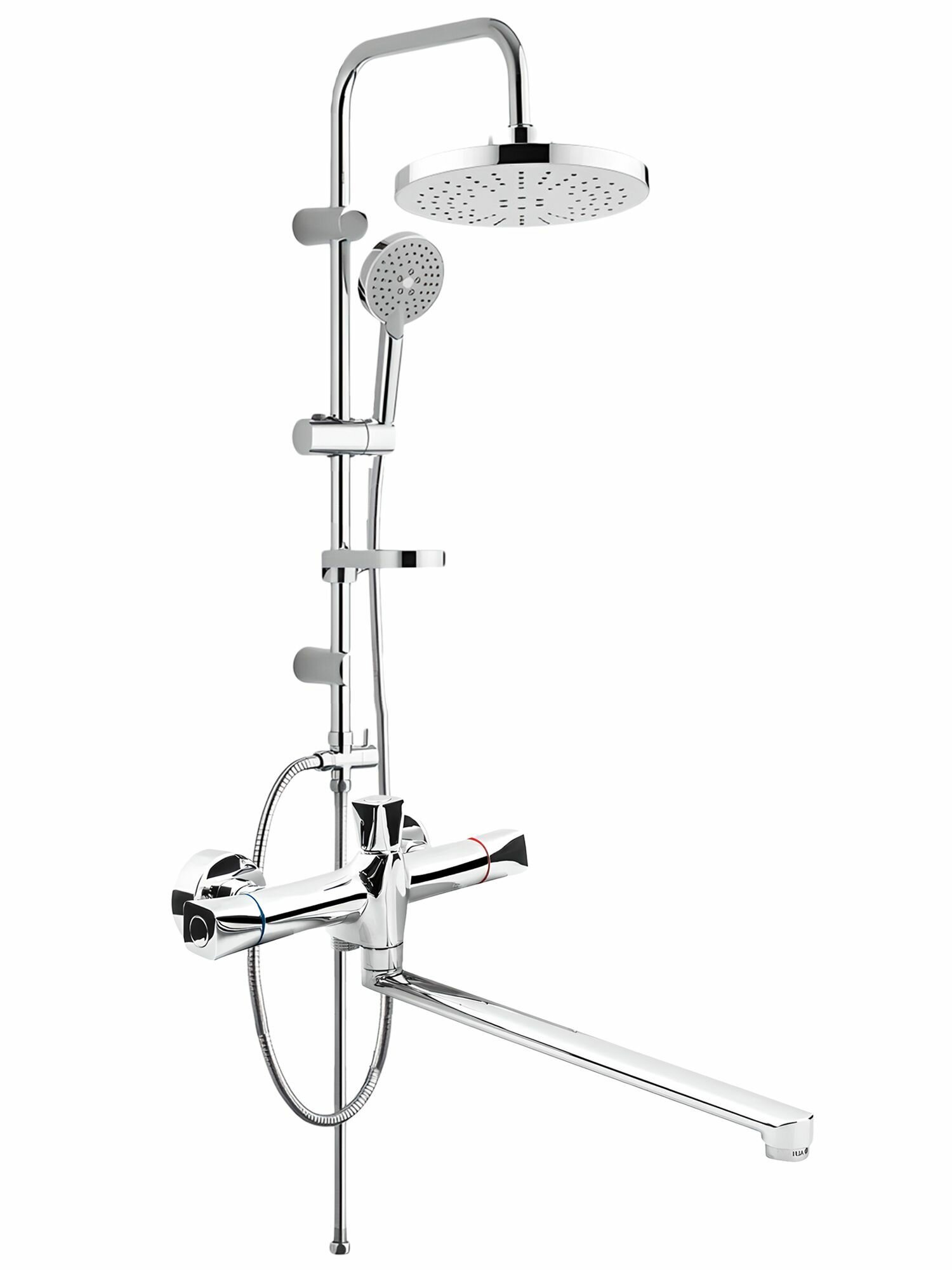| Комплектация | вентиль / верхний душ / держатель лейки / душевая штанга / излив для набора воды / лейка / мыльница / отражатель / переключатель потоков / ручной душ / Смеситель / шланг / эксцентрик |