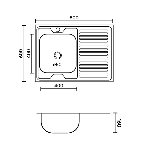 Мойка для кухни FABIA врезная, 78х48, глубина 160 мм, большой сифон с переливом, нержавеющая сталь
