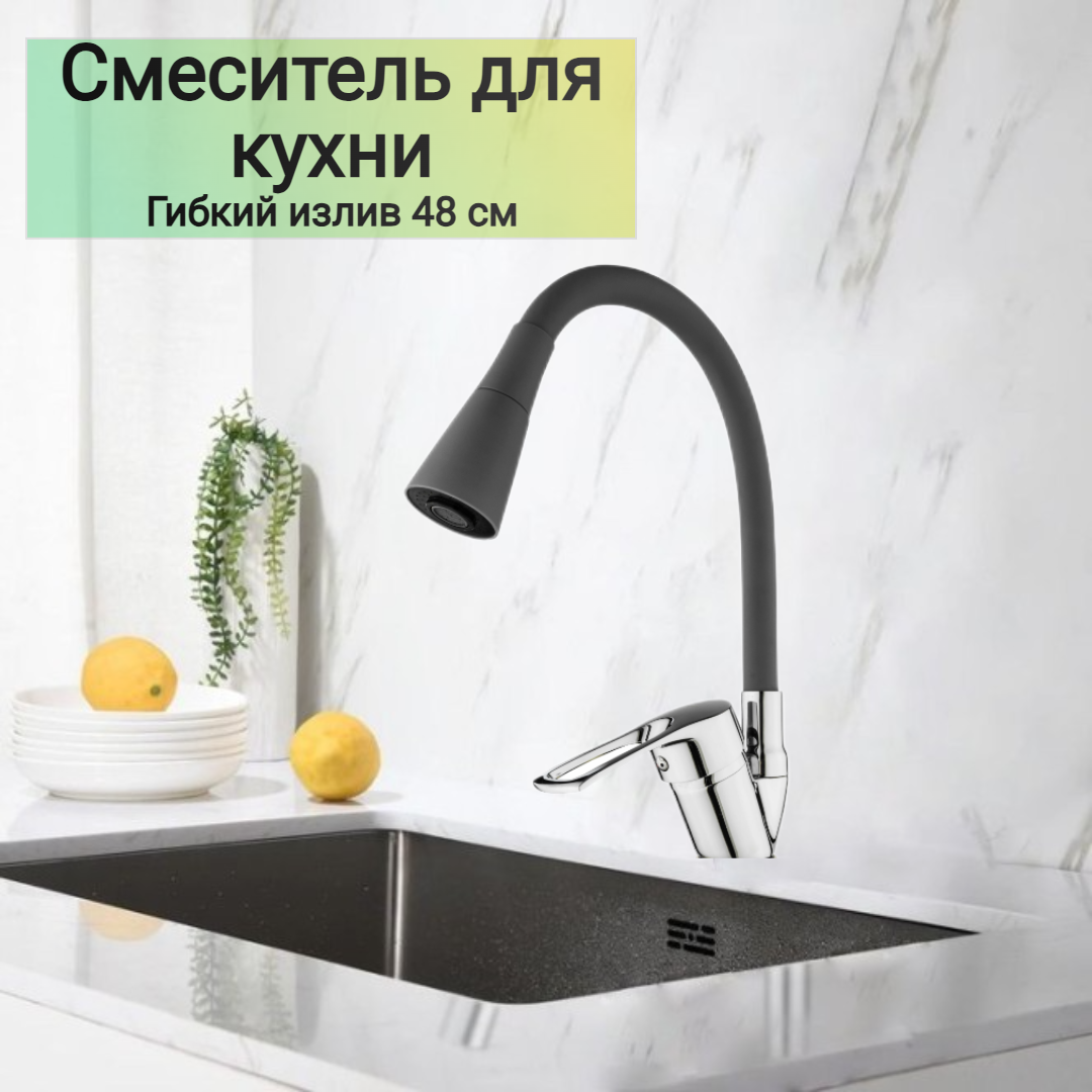 Смеситель для кухни с гибким изливом, кран на кухню DER43-229BL БЕЗ ГИБКОЙ ПОДВОДКИ, хром/ черный