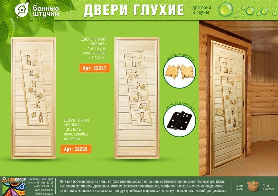 Дверь глухая "Банька", 1,9х0,7 м, липа Класс А, короб из сосны, с ручками и петлями "Банные штучки" в кор. интересное: