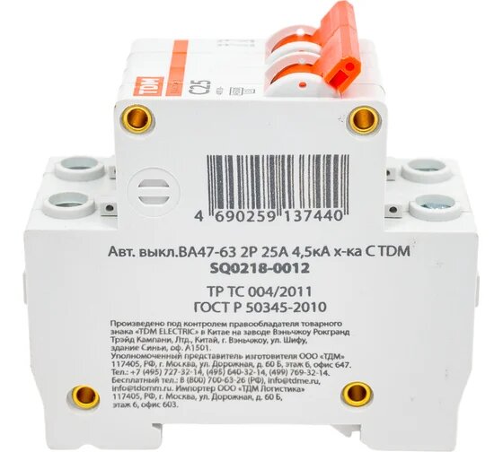 Автоматический выключатель Tdm Electric ВА47-63 2Р 25А 4,5кА х-ка С, SQ0218-0012