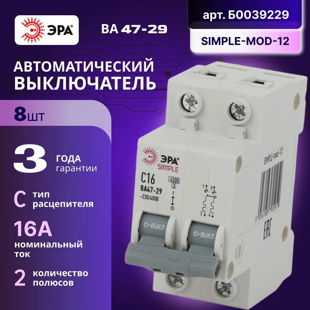 Ниже Вы можете прочитать отзывы на Автомат Б0039229 ЭРА SIMPLE-mod-12 2P 16А (С) выключатель ВА 47-29 8шт, ознакомится с подробными характеристиками, посмотреть интересные обзоры и фотографии на Автомат Б0039229 ЭРА SIMPLE-mod-12 2P 16А (С) выключатель ВА 47-29 8шт.