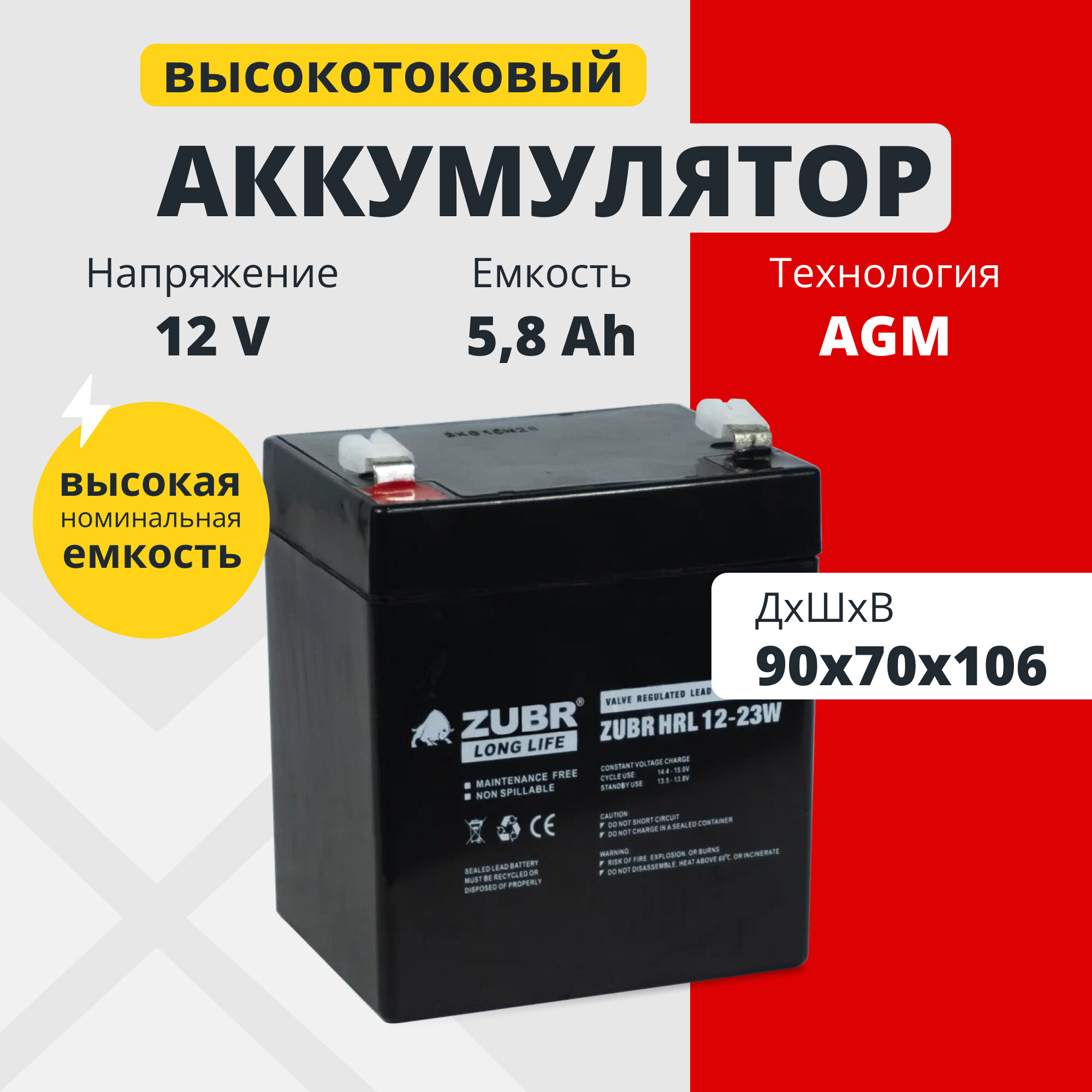 Аккумулятор для ибп 12v 5,8Ah ZUBR AGM F2/T2 акб детской машинки, весов 90x70x106 мм интересное:
