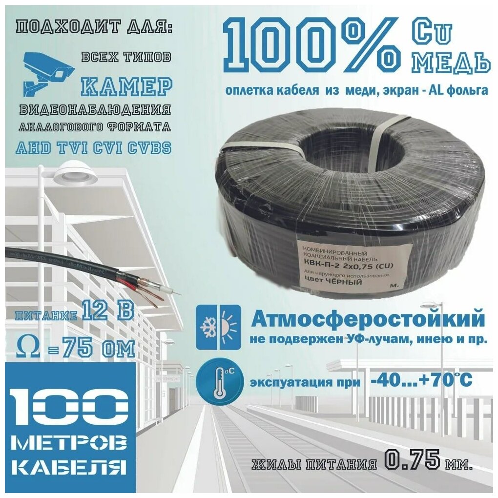 Купить Кабель комбинированный для видеонаблюдения черный КВК-2П 2Х0,75 RG-59 Cu+CCA для уличной прокладки (бухта 100м)
