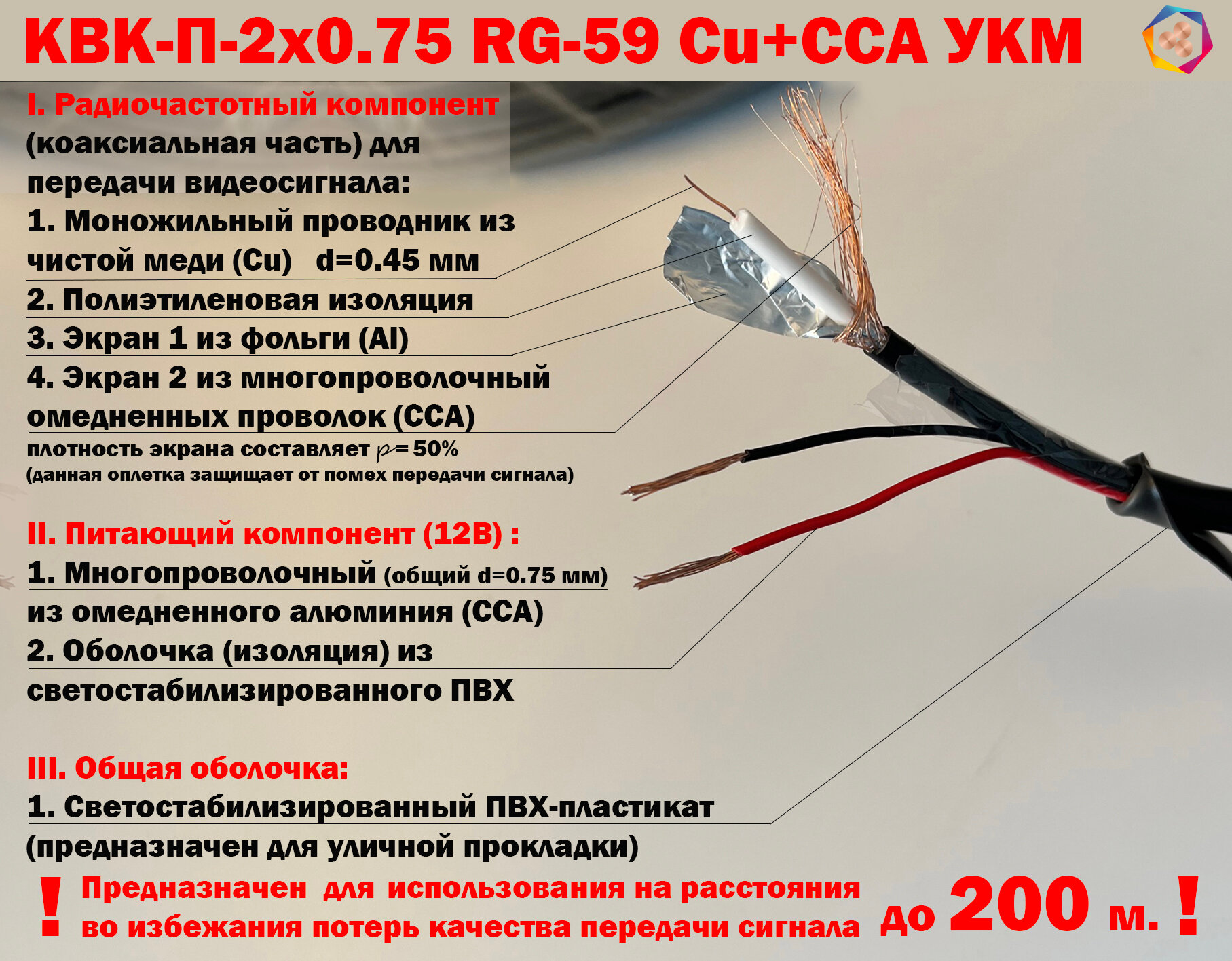 | Дополнительная информация | Коаксиальная часть моножильный проводник из чистой меди CU, D=0.45мм+экран из фольги и омедненного алюминия. Питающая часть многопроволочная из CCA ( омедненный алюминий). |