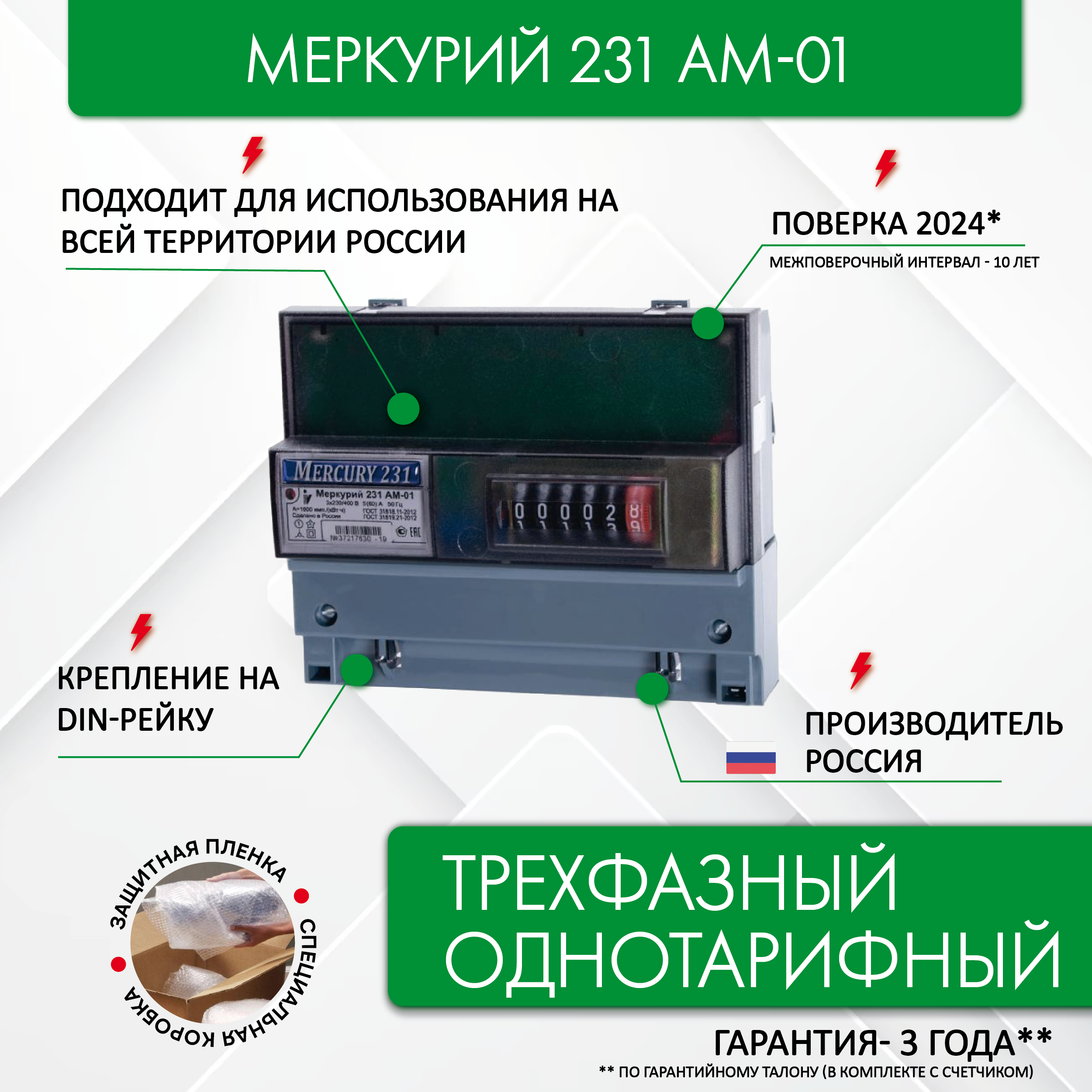 Счетчик э/энергии 3-фаз. 5 - 60А Меркурий 231 АМ-01 к. т.1.0, 1-тар. электр. на ДИН-рейку