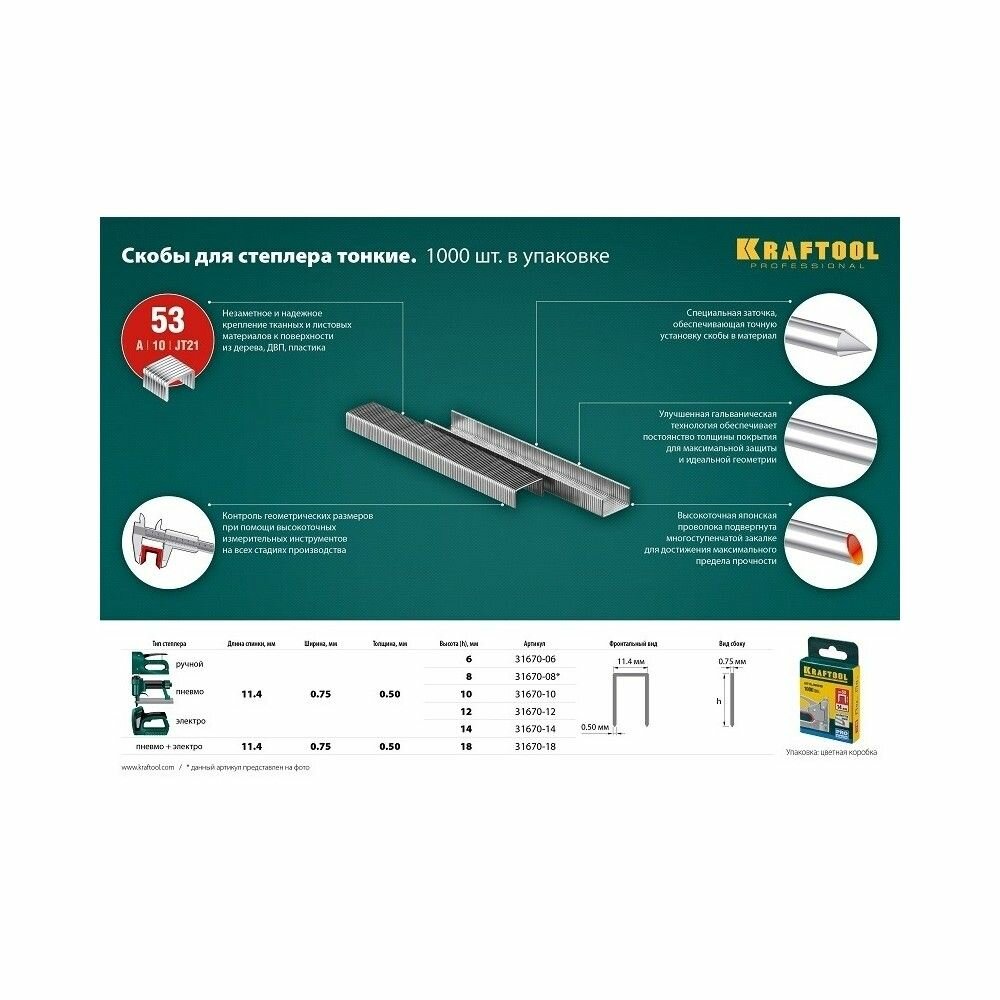 скобы для степлера, KRAFTOOL тип 53 (A/10/JT21) 8 мм, 1000 шт, калибр 23GA, (31670-08) интересное: