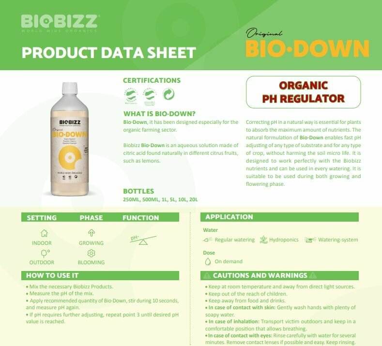 | Дополнительная информация | Почему стоит выбрать Bio pH-? Bio pH- можно использовать как в вегетационный период, так и в период цветения, при любом поливе и в сочетании с любым субстратом или удобрением Biobizz. Bio pH- не содержит сильных кислот. Это означает, что этот 100%-ый органический регулятор pH не наносит вреда микрофлоре субстрата. |